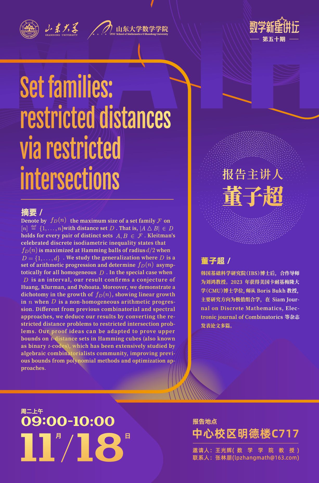 上一条:数学学院新星讲坛第51期:Muticolor Erdos--Rogers Functions