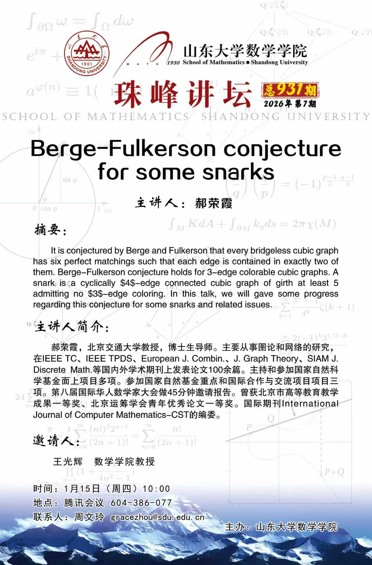 上一条:数学学院珠峰讲坛第932期:On the maximum diversity of intersecting families in the symmetric group