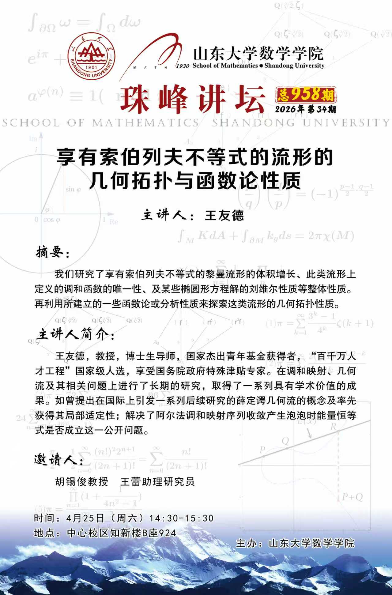 上一条:数学学院新星讲坛第63期:On the universal local and global properties of positive solutions to $\Delta_p v+b|\nabla v|^q+cv^r=0$ on complete Riemannian manifolds