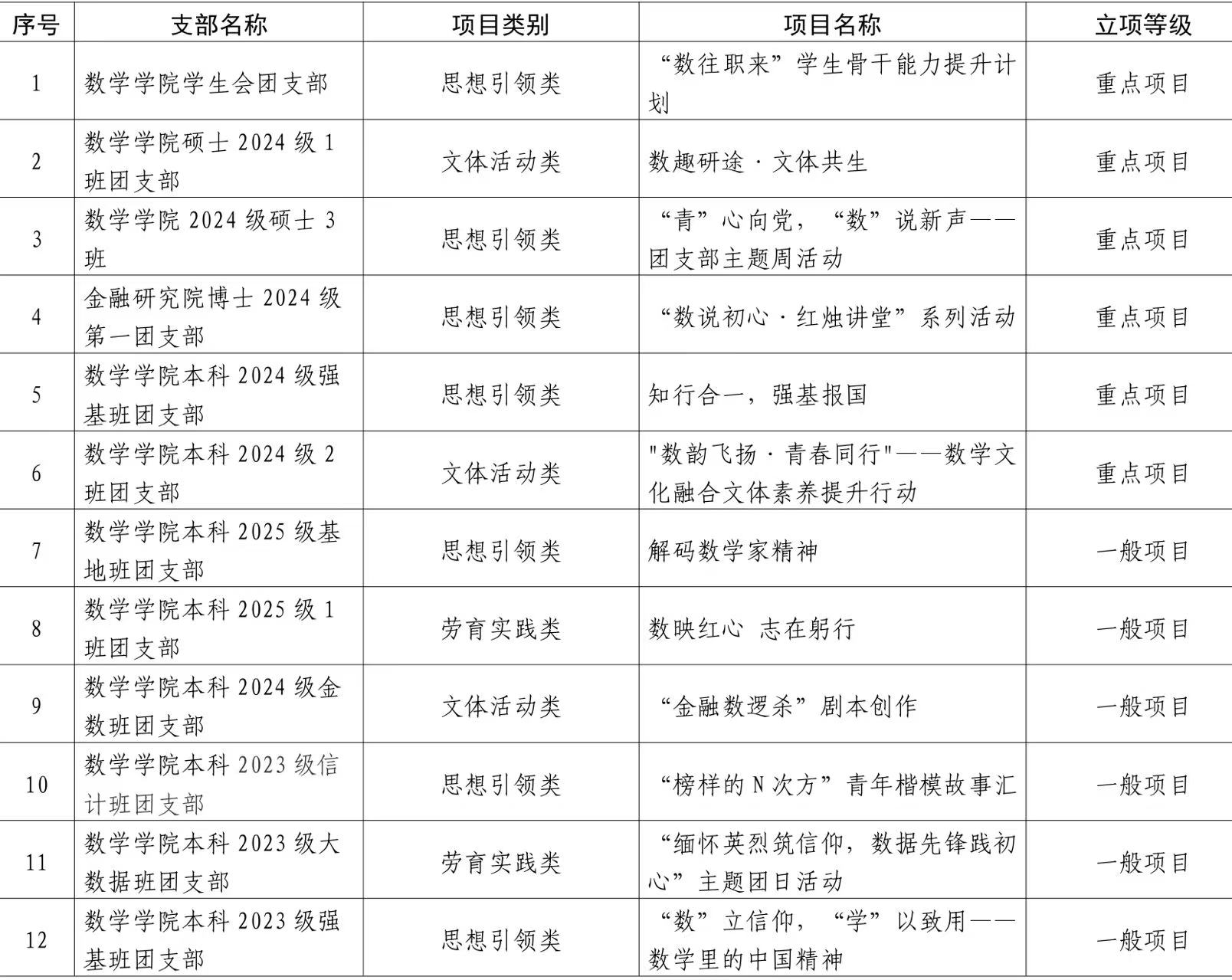 根据《关于开展山东大学数学学院首批“先锋培育计划”团支部立项工作的通知》安排,经支部申报、年级审核、学院评审,现将立项结果公布如下: